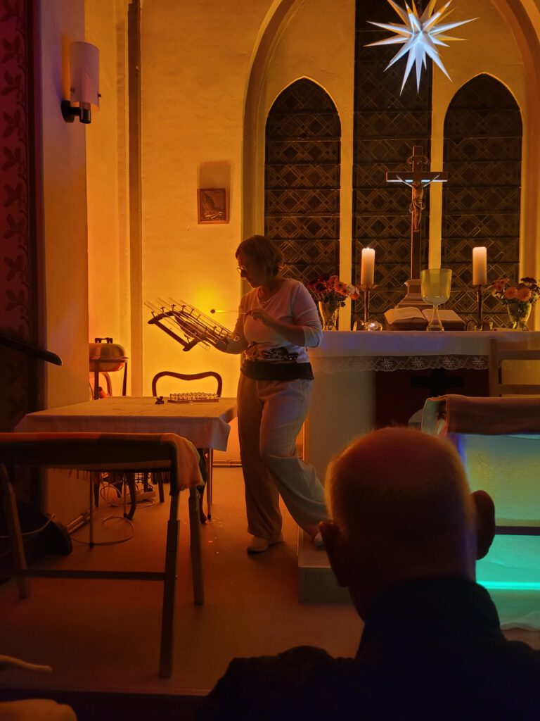 Zum zweiten Mal durfte ich in der kleinen Kapelle in Essinghausen / Peine ein Klangkonzert mit meinen zauberhaften Instrumenten geben. Zu meinem Glück hatte ich wunderbare Unterstützung. Mein Mann baute mir extra ein Podest und einen Instrumentenständer. Steffen Ellersdorfer zauberte neuen Glanz in unsere schöne Kapelle mit seiner Lichtkunst und fantastischen Leuchtmitteln. Ein schönes warmes und einladendes Ambiente wurde für die Besucher geschaffen. Mich hat es sehr gefreut, dass sich die Reihen bis in die letzte Bank gefüllt haben. Herzlichen Dank für all die Wertschätzung und wer weiß was im November 2026 sein möchte….
